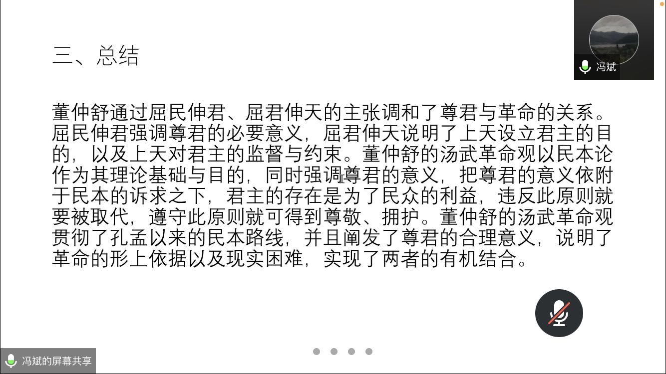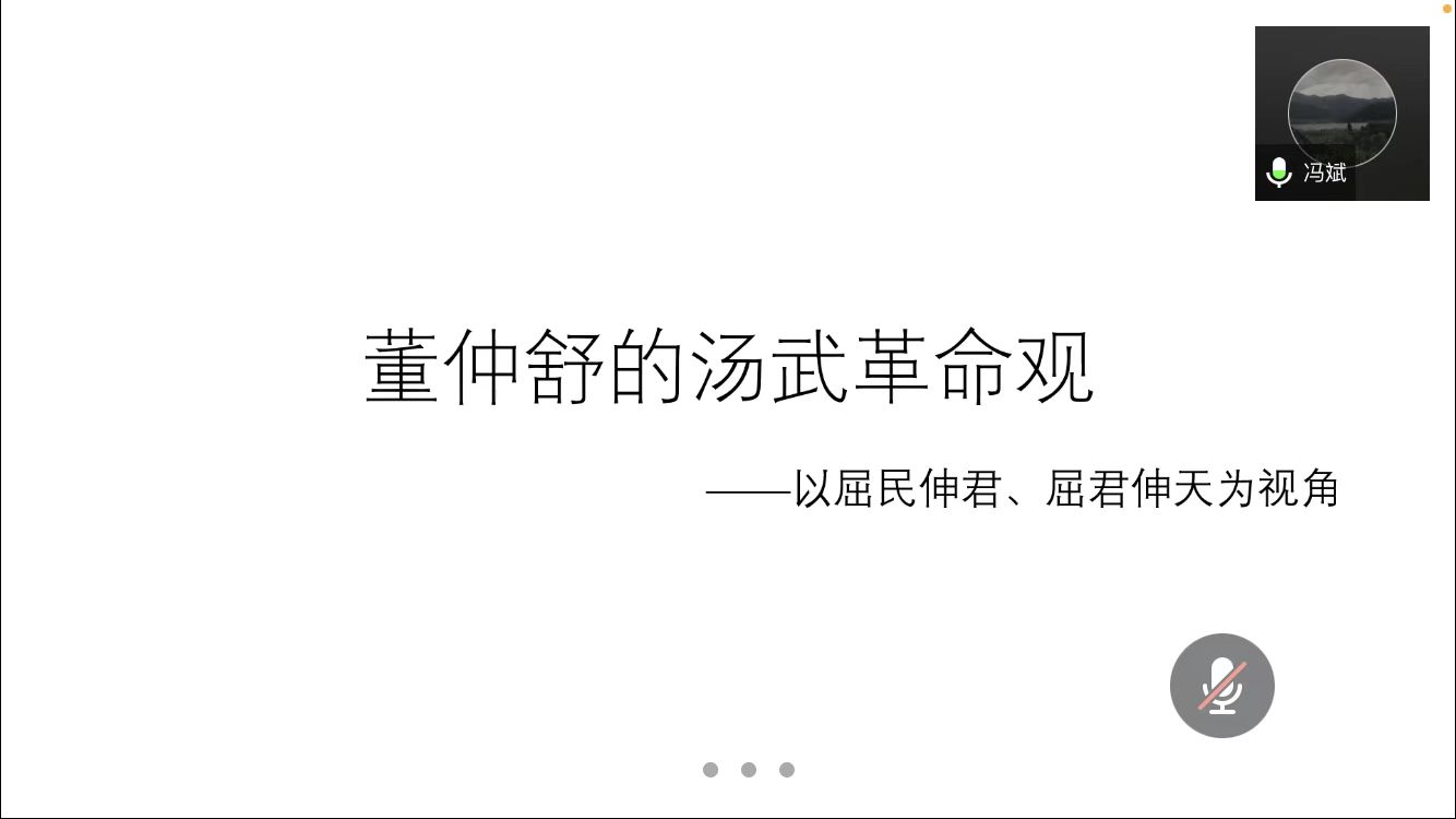 2022年5月28日,由太阳成集团tyc151cc研究生院、党委研究生工作部主办,太阳成集团tyc151cc承办的第十一期(总第774期)“海右”博士生学术论坛在腾讯会议成功举办。本期论坛的主题为“董仲舒的汤武革命观——以屈民伸君、屈君伸天为视角”,由太阳成集团tyc151cc中国哲学2021级博士生冯斌担任主讲人,博士生导师谭明冉教授作为点评嘉宾出席论坛。论坛由太阳成集团tyc151cc2021级硕士研究生陈滢如主持,校内外硕士、博士研究生参与。