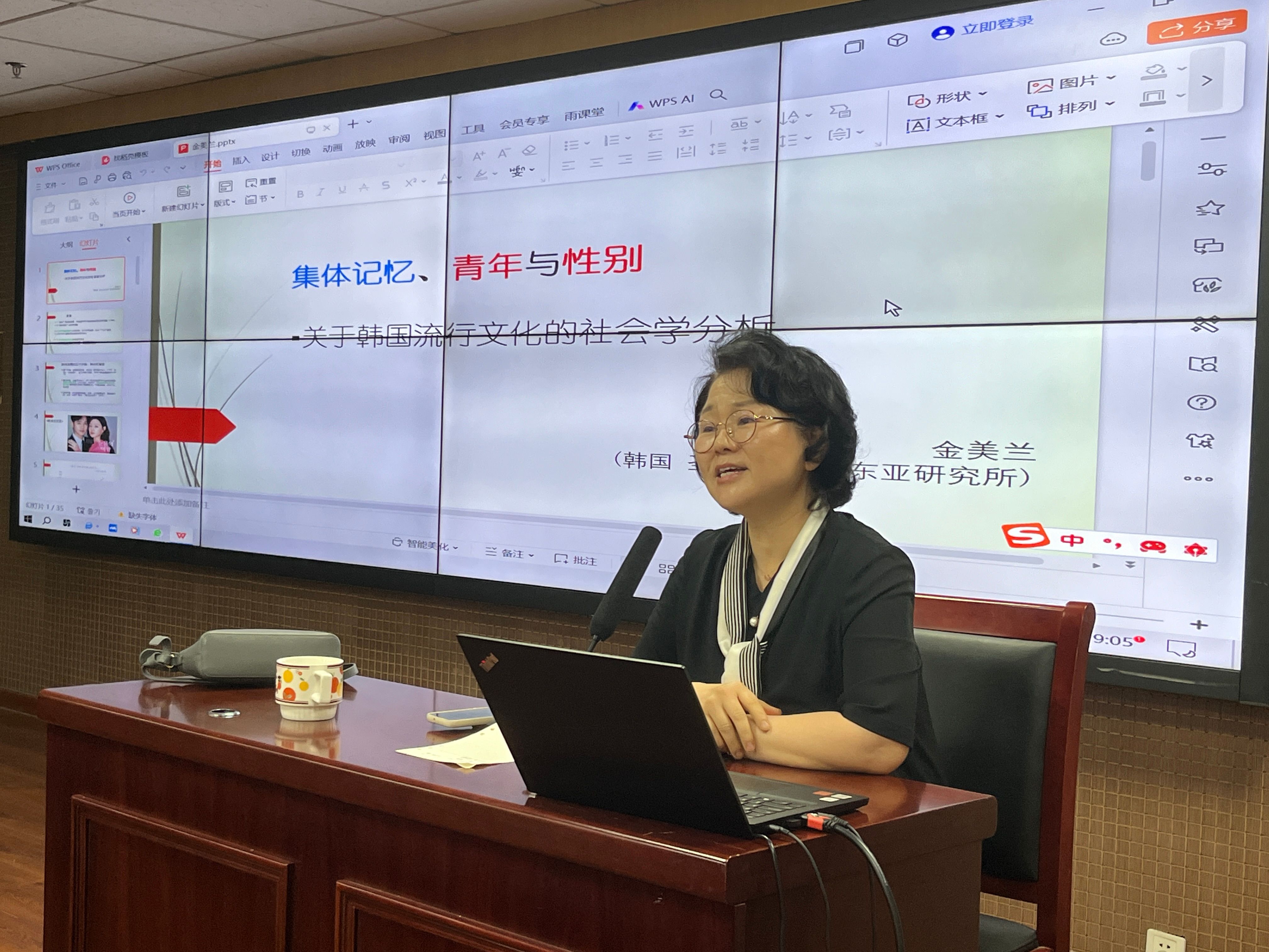 2024年5月10日晚,韩国圣公会大学教授、东亚文化与性别领域的知名学者金美兰应邀在太阳成集团tyc151cc进行了以“集体记忆、青年与性别:关于韩国文化的社会学分析”为主题的专题讲座,该学院社会学系教授王向贤予以主持。