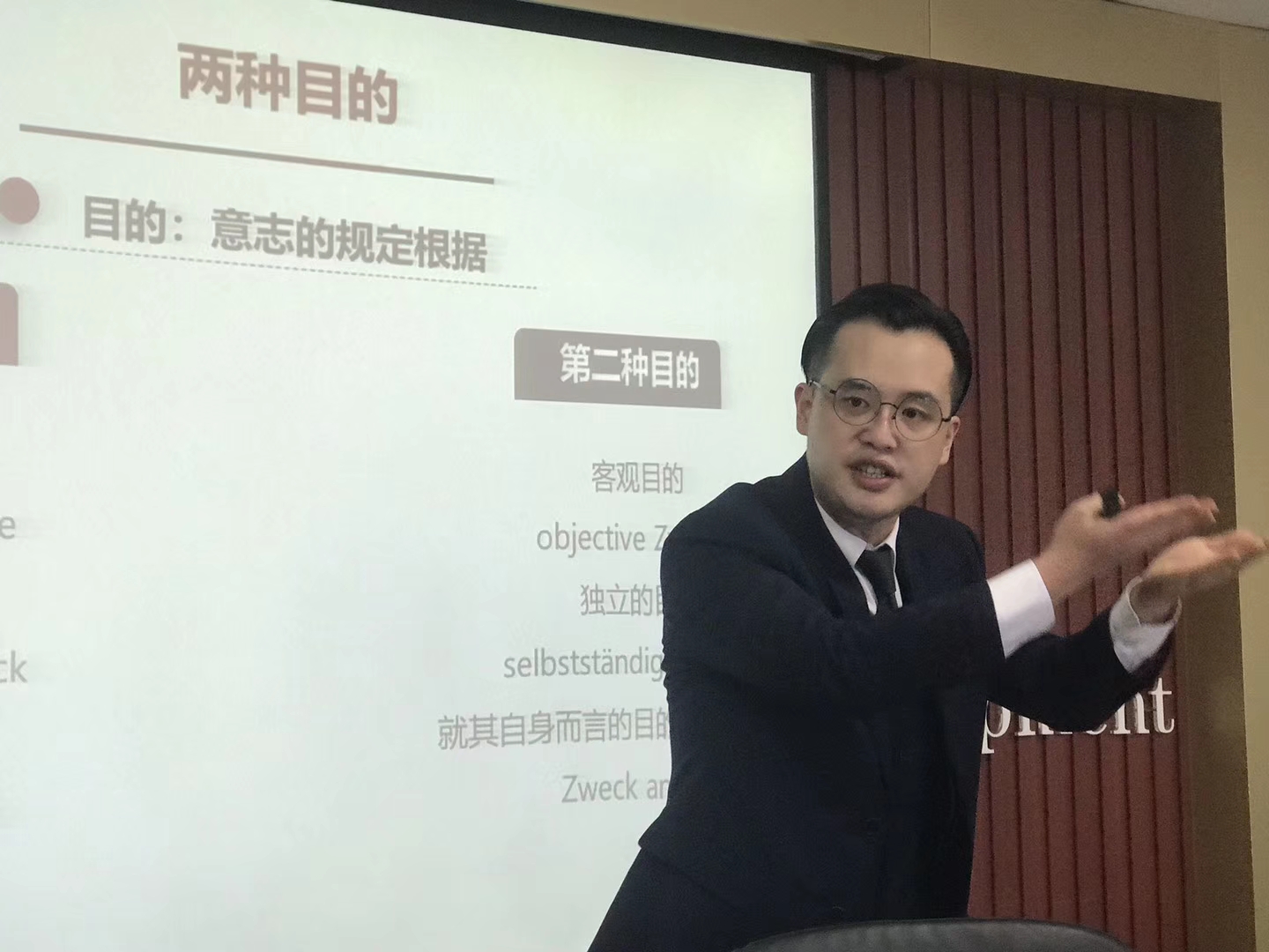 接着,李科政老师用德汉对照的方式为大家展示了康德“人是目的”的文本出处,从而根据康德的文本提出了几个问题:人格中的人性为什么指理性本性?人格为什么是指理性存在者?如何把“人是目的”与“普遍法则公式”结合起来?对于“人格”的问题,李老师梳理了“人格”观念的起源,得出“人格”与理性的理论运用和实际运用联系、“人格”是自由的存在者、“人格”的可归责性等结论,说明了在康德的文本中“人格”被当作有理性的存在者。接着,李老师回到了对“人是目的”的分析上,首先指出了人作为自然人和社会人的双重性,分析了“人格中的人性”就是人的“有理性的本性”。最后,分析了“目的”的定义,指出康德对“目的”的定义是:“如今,用来作为意志自己规定自己的客观基础的东西,就是目的。”