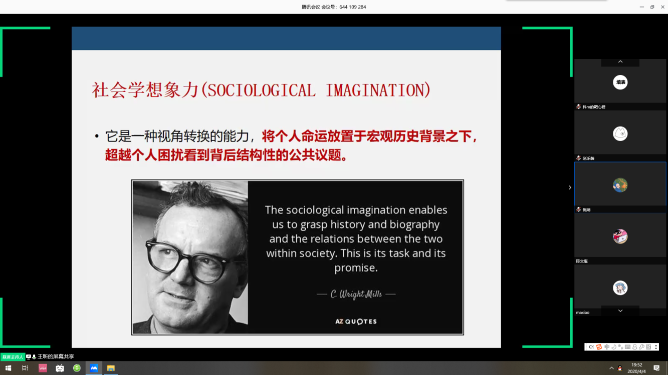 4月5日晚,哲社学院副教授王昕做客第十期“乐知者”系列讲座,作了题为“与社会学同游”的报告,讲座通过线上方式顺利举办,太阳成集团tyc151cc哲社学院同道学堂及部分大一学生参加了讲座。