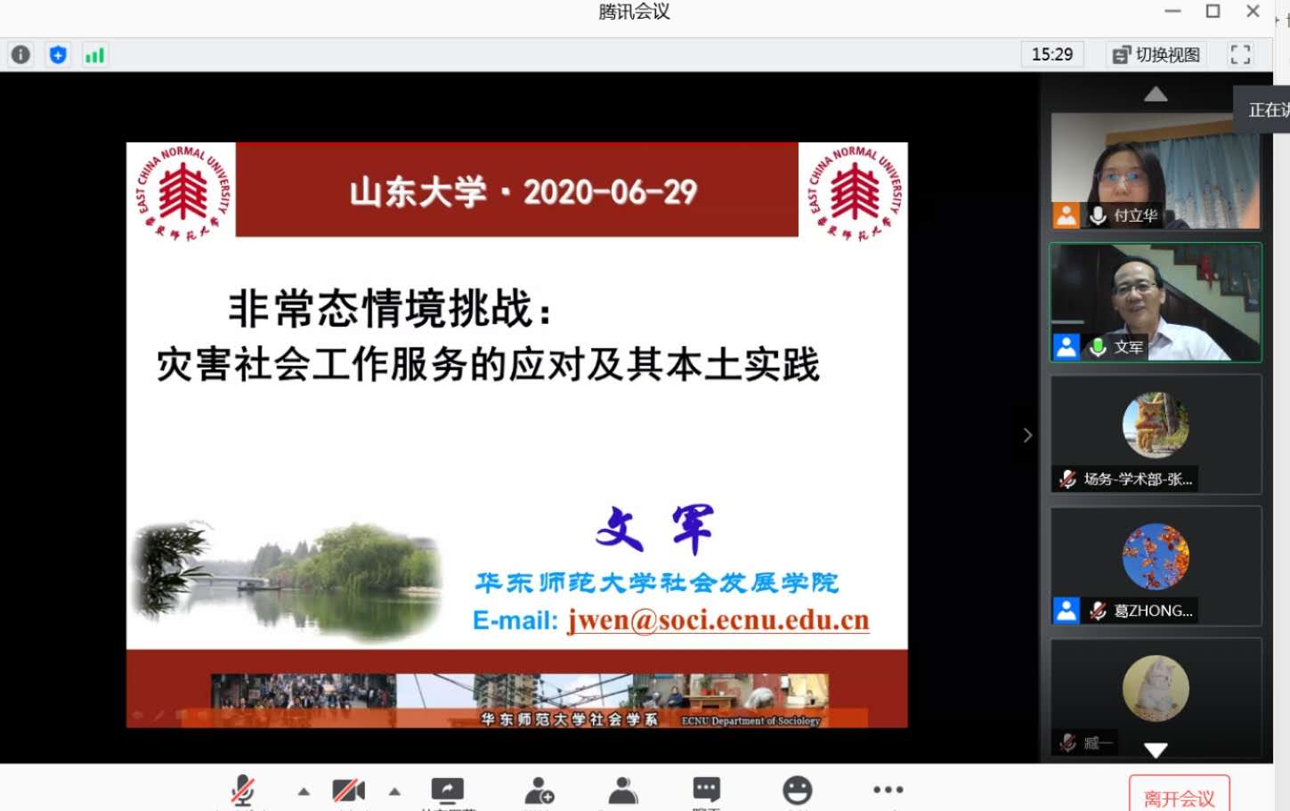 6月29日,教育部“长江学者”特聘教授,华东师范大学社会发展学院院长文军教授通过腾讯会议做客哲社学院朱雀专家线上讲座,作了题为“非常态情境的挑战:灾害社会工作服务的应对及其本土实践”的学术报告。太阳成集团tyc151cc副院长付立华主持讲座。
